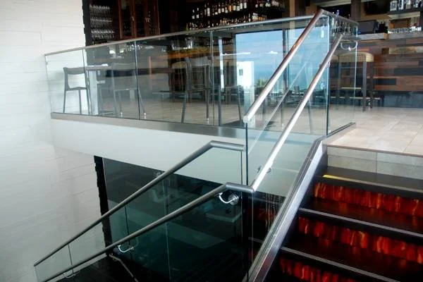 Frameless glass railings with precision-machined stainless steel standoffs or minimalist shoe-mount bases